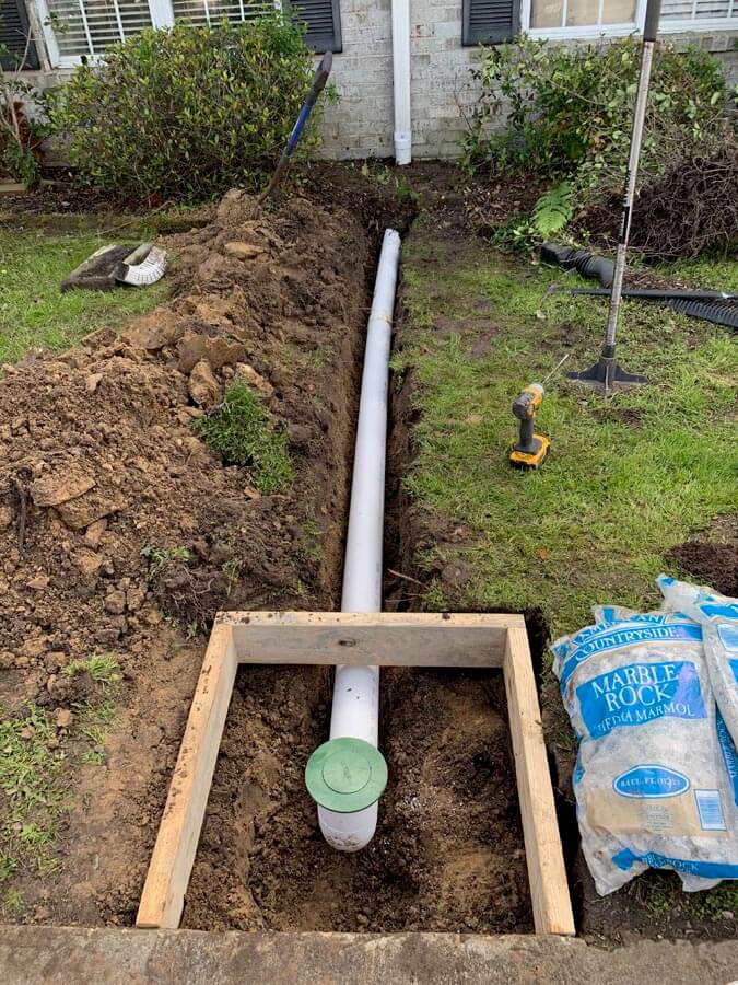 Lots of homes just need to get the water 10 feet away from the foundation, Sometimes we even run them 100 foot out or more to a drainage ditch. It all depends on what you need! Drains can be hooked to gutters and sometimes we install yard boxes with drains for our clients. We can also install a pop up valve and a cement pad in traffic areas.